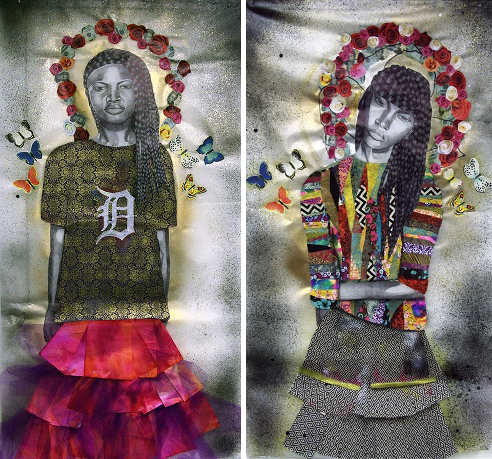 Dipped in head-to-toe black and her signature winged eyeliner, artist Jamea Richmond-Edwards holds court; her Kweendom come amid the rush of enthusiastic praise for her solo exhibition of new work, Prom Night. Family, friends, former students, curators, and collectors all spellbound by faces rendered in elegant grayscale engulfed in riotous color and richly layered texture. Ink and paint, fabric and glitter, multi-patterned and marbleized paper, and the occasional doorknocker earring create an elaborate mixed-media fantasia – the unabashed celebration of the pomp and pageantry that is prom night in Black culture. Mylar balloons customized with a silhouetted prom "Kween" hover festively above as Edwards' Detroit homie, DJ Mal rocks the decks, inspiring some folks to do the Hustle. A follower on social media proclaims, "This is the blackest exhibition I've ever been to!" Richmond-Edwards is delighted: "For someone to say that, I've achieved everything I needed to achieve." It's a vibe marked by self-assured girls with commanding gazes, bold fashion, stiletto nails, and fly whips with spinner rims. Their braided beaus meet their undeniable flyness in swaggy splendor. In the centerpiece of the exhibition, Fly Whips and Fly Girls, two young women, serving face and fierce fashion predominate – it is their night. Still, scattered throughout the large scale, four-panel tableau, to moving effect, are houses and neighbors, representing community – the village an intrinsic part of the coming-of-age ritual, to buoy them and see them for the women they are becoming.